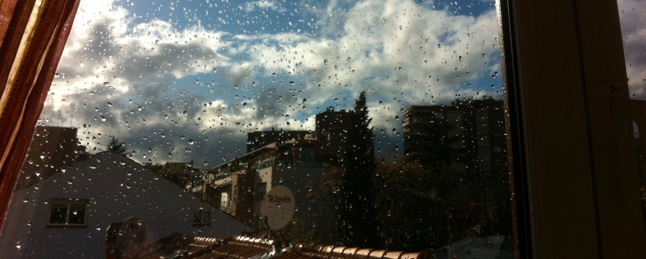 La tormenta ha borrado el verano de golpe, llenando los cristales de gotitas.
